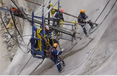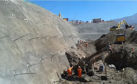 La solución de estabilización permanente propuesta por la empresa consideraba, en una primera etapa la construcción de un talud anclado al basamento rocoso mediante la ejecución de 180 anclajes permanentes de cable post-tensados, reforzado superficialmente por malla y shotcrete.